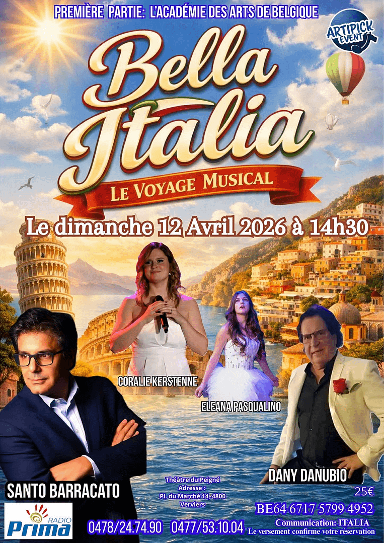 Bella Italia – Le Voyage Musical vous invite à vivre un moment unique, rempli de chaleur, d’émotion et de mélodies inoubliables. À travers les plus belles chansons italiennes, ce spectacle ensoleillé vous transporte des grandes places romaines aux ruelles napolitaines, dans une ambiance conviviale et festive.