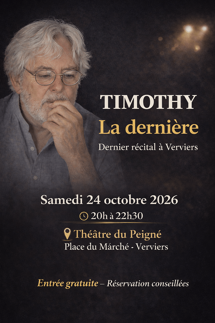 Ce concert unique s’inscrit dans la continuité d’un parcours artistique riche mêlant musique, chanson, peinture et littérature. Pour cette dernière prestation en Belgique, Timothy sera entouré de plusieurs artistes invités, dont Luigi, Didier Vincent et Aril Laury (groupe Kheops).